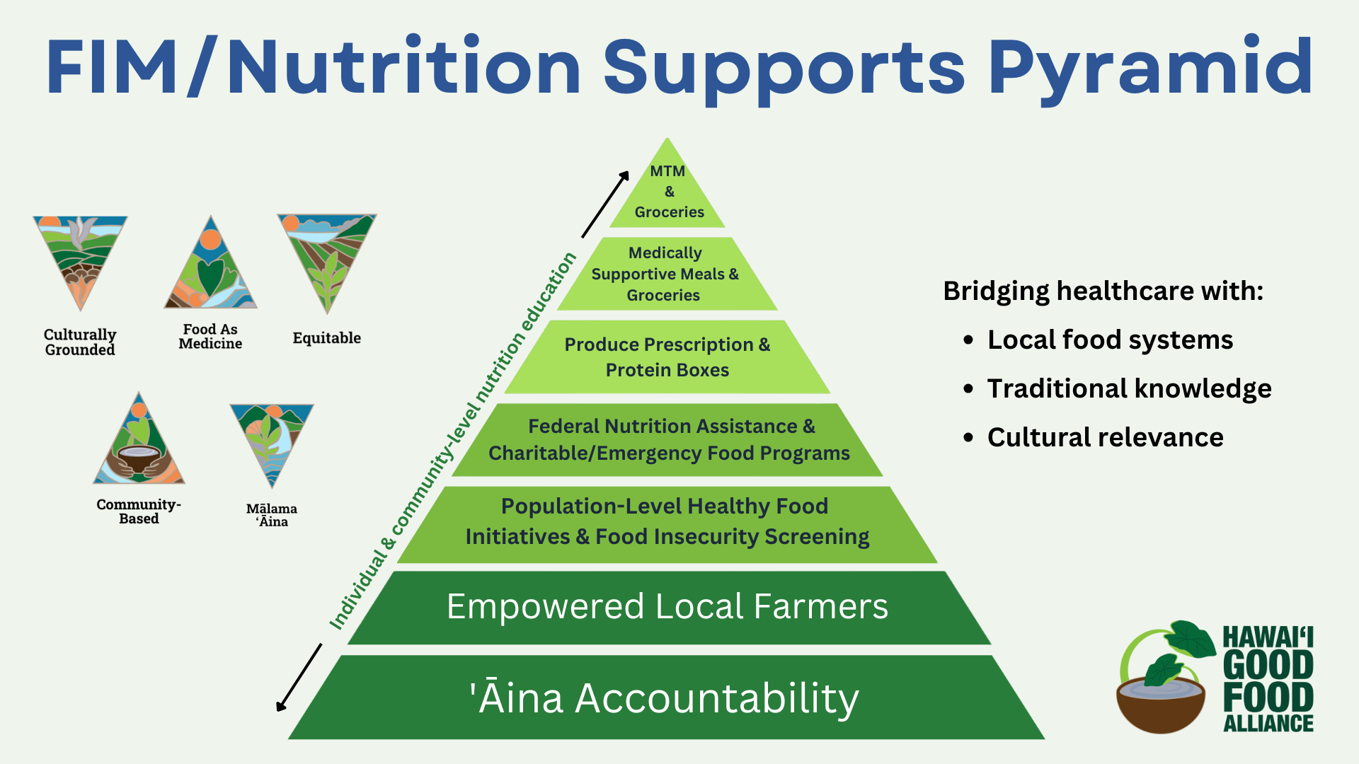 HGFA is working with partners to integrate FIM into Hawaiʻi’s Medicaid system through medically tailored meals and prescription produce boxes that “encourage the inclusion of local growers, community gardens, and other community-based organizations to support the purchase of locally grown food and strengthen Hawaii’s intrinsic food system.”